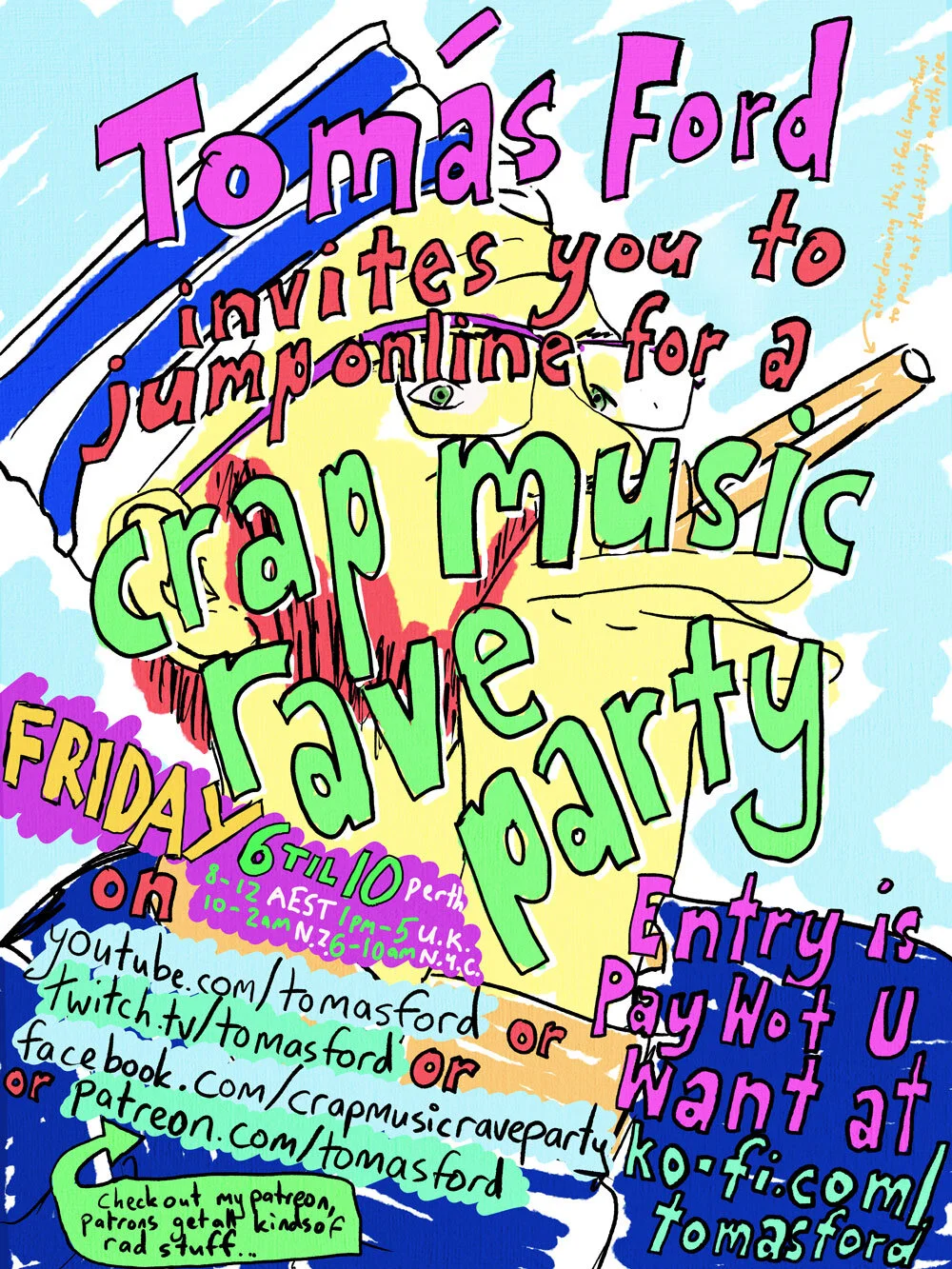 This friday, I’m livestreaming Crap Music Rave Party before Facebook’s new rule changes sweep in and make my online streaming life a bit more tricky. On one hand, it’s the worst place to see me stream, but on the other hand, it’s superhelpful for getting eyeballz on the webcasts. Still, I reckon you should hit my Twitch or YouTube instead.